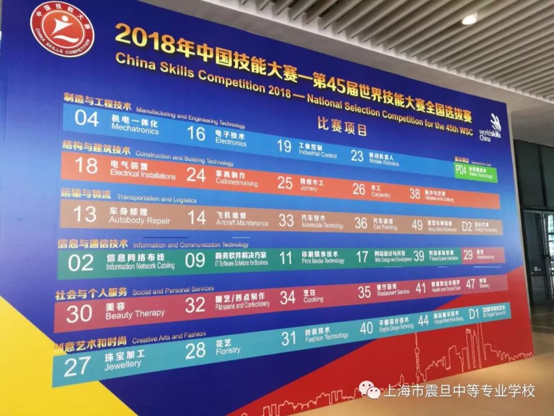 本次大赛共设有汽车技术、木工、机电一体化、网络系统管理、时装技术、健康和社会照护等34个比赛项目,覆盖世界技能大赛中运输与物流、制造与工程技术、结构与建筑技术、信息与通信技术、创意艺术与时尚、社会与个人服务等全部六大领域。来自全国的46个代表队、约900名选手参加上海赛区比赛。