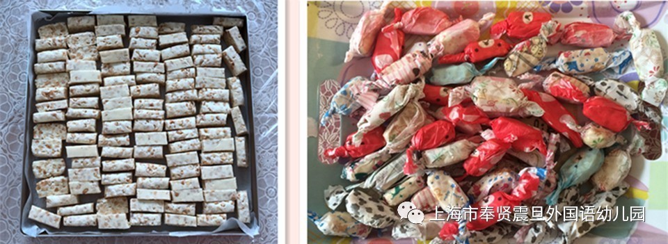 我们的“妈妈老师”特别亲和耐心的指导孩子们怎样把牛轧糖包裹的紧紧的。
